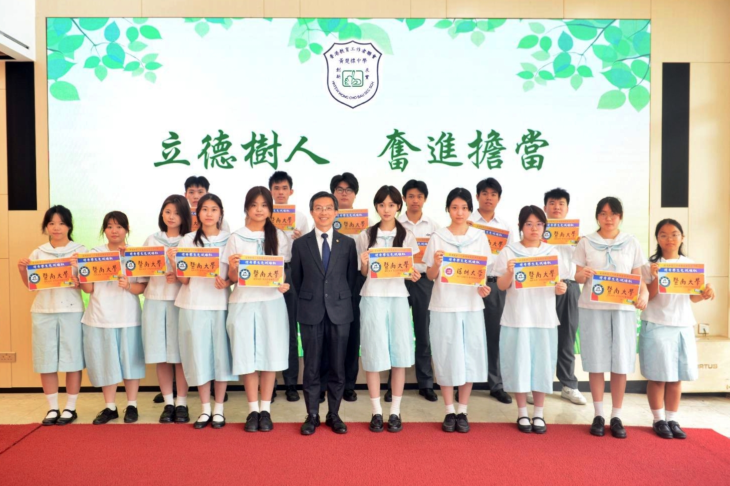 本日全校師生喜氣洋洋,除大部分同學決定於本地升讀外,早前已經有34位同學憑藉出色的成績,獲復旦大學、暨南大學、華僑大學及深圳大學提前錄取,他們均感恩母校和老師的悉心指導,並認為母校是他們「成長、成功、成才」的重要搖籃。