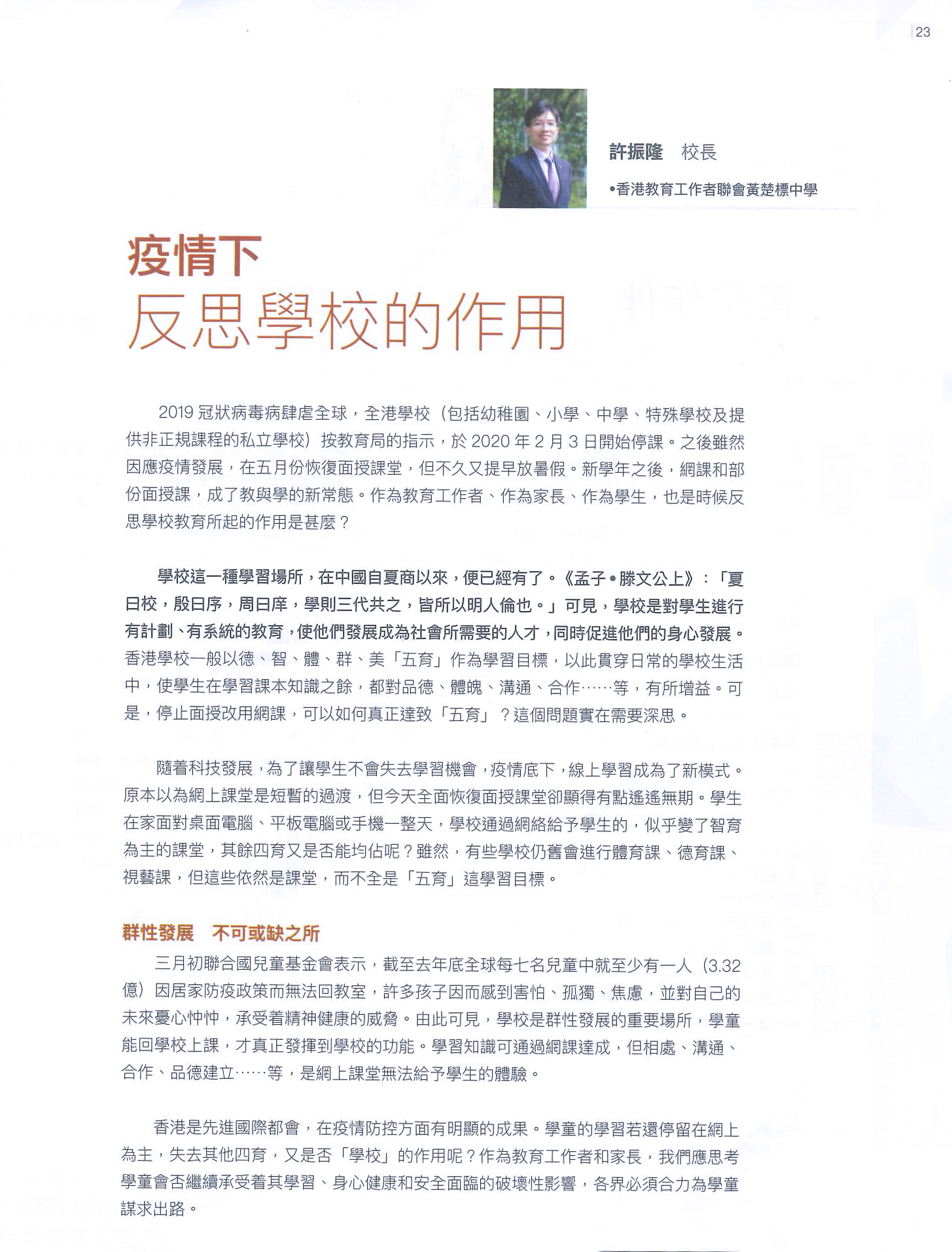 許振隆專訪: 疫情下 反思學校的作用(《香港教育雜誌》第37期)