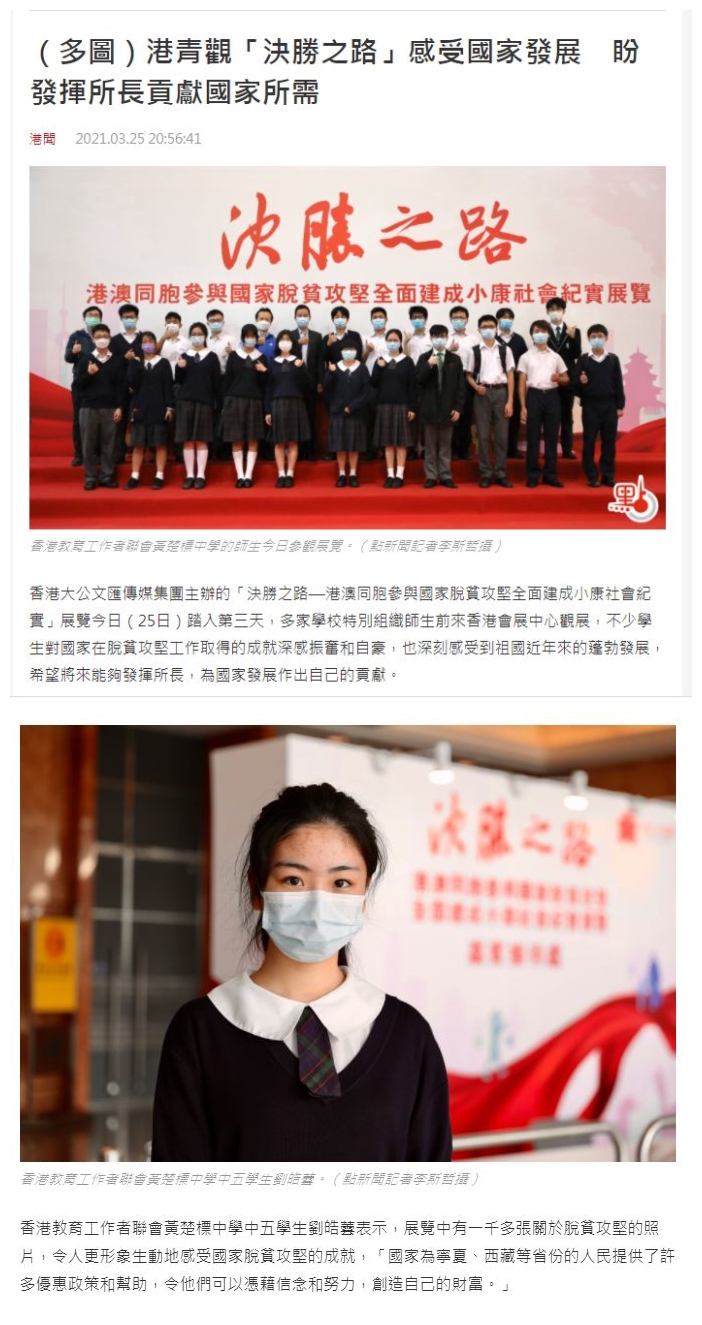 上一篇:中學生參觀「決勝之路」感振奮 冀為國家發展做貢獻(大公報 2021-03-26)