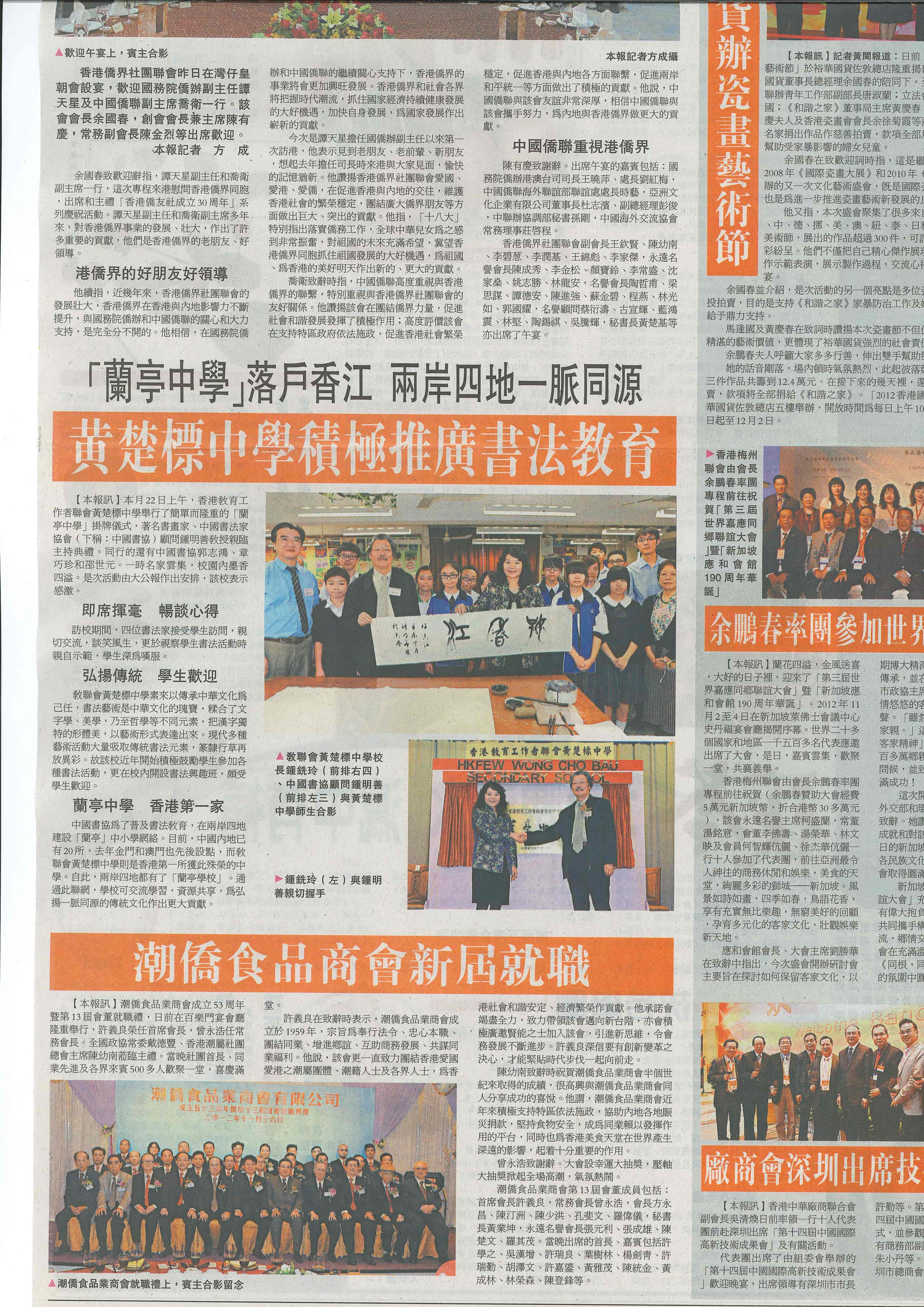 黃楚標中學積極推廣書法教育(大公報 26/11/2012)