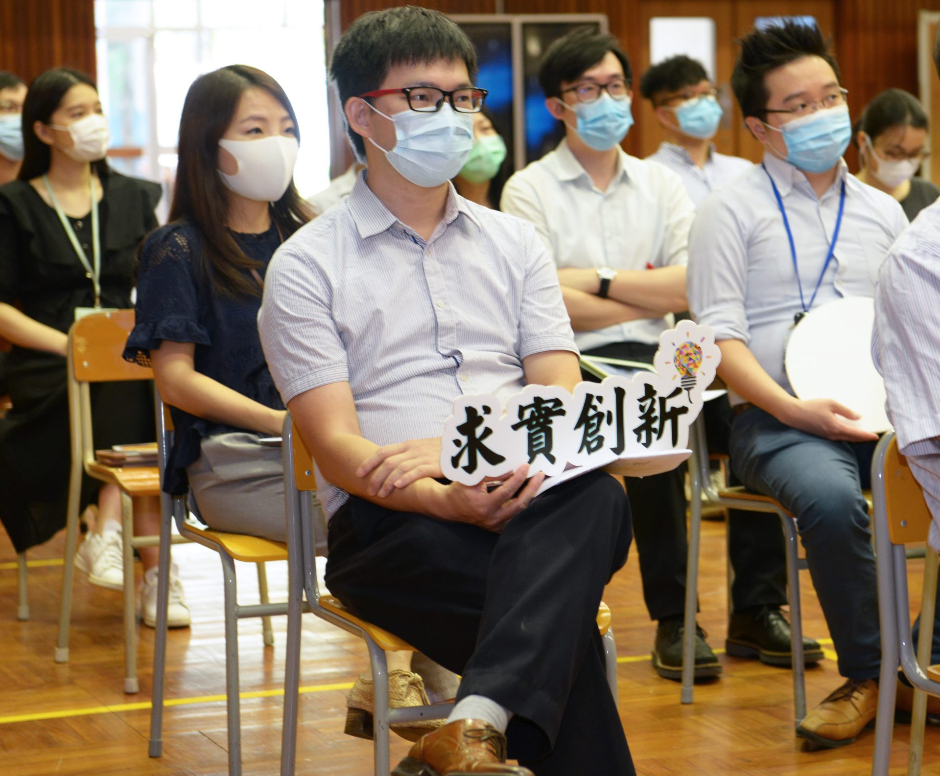 老師拿標語為學生鼓氣加油