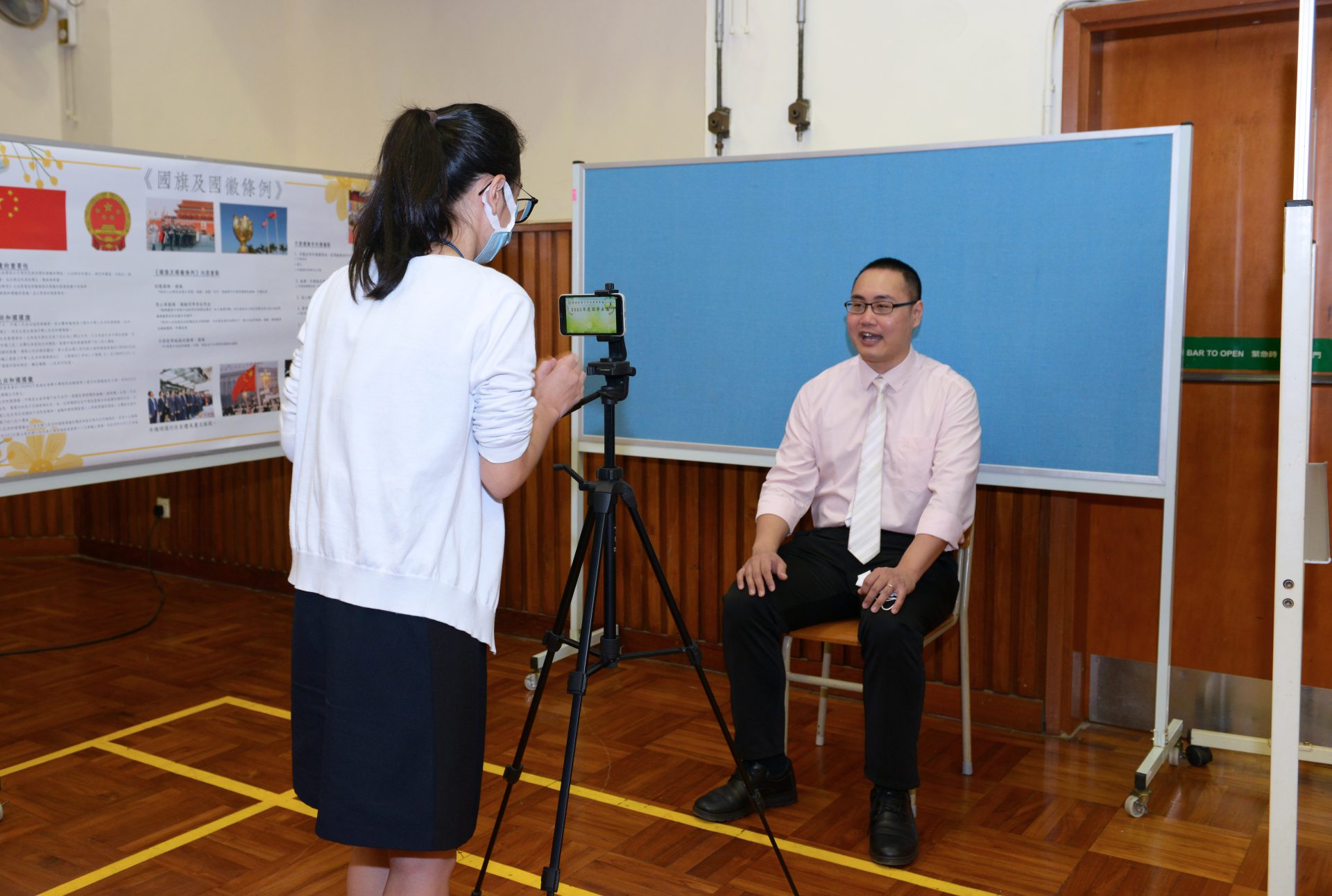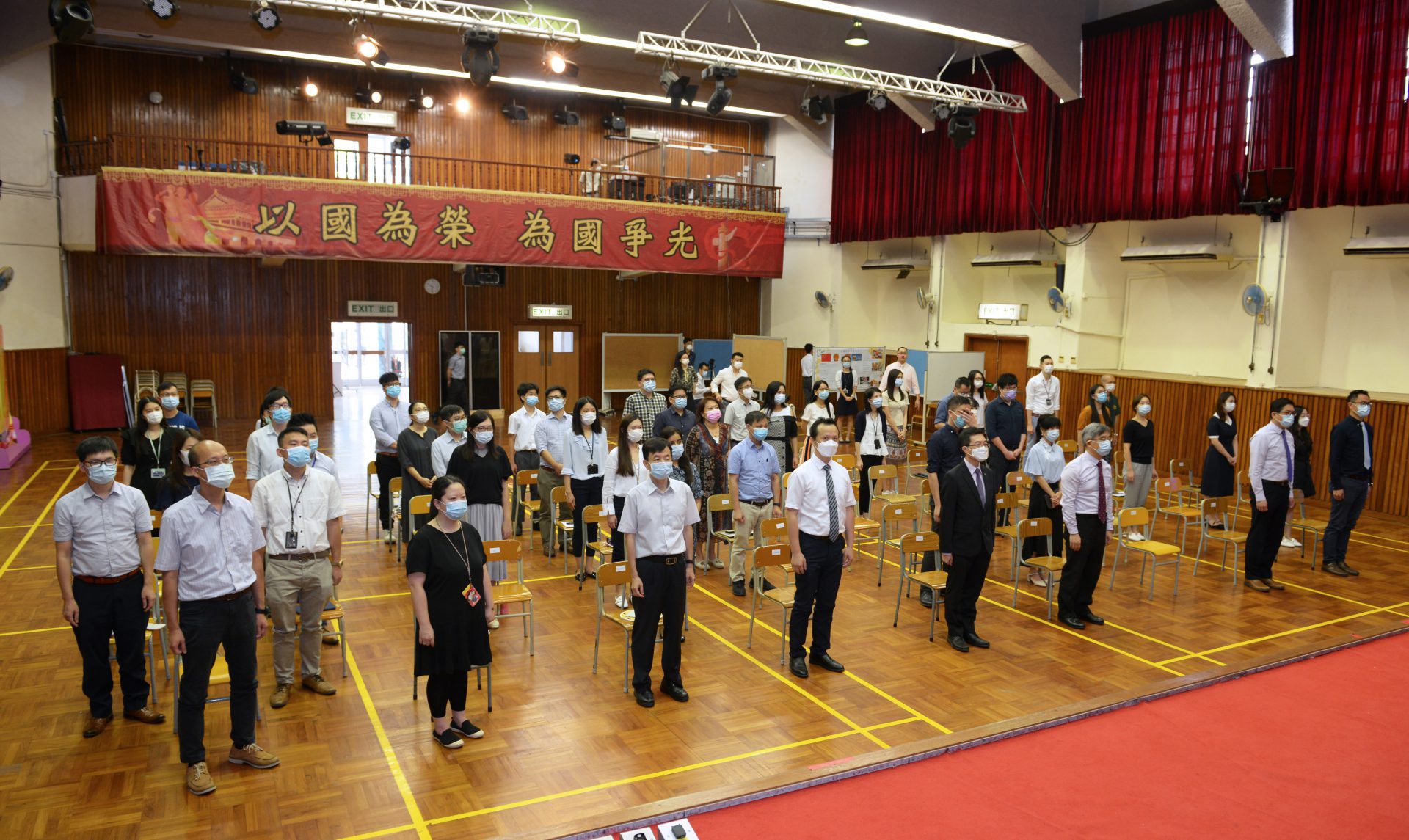 國歌響起,全校所有教師與雲端的學生均起立同唱國歌