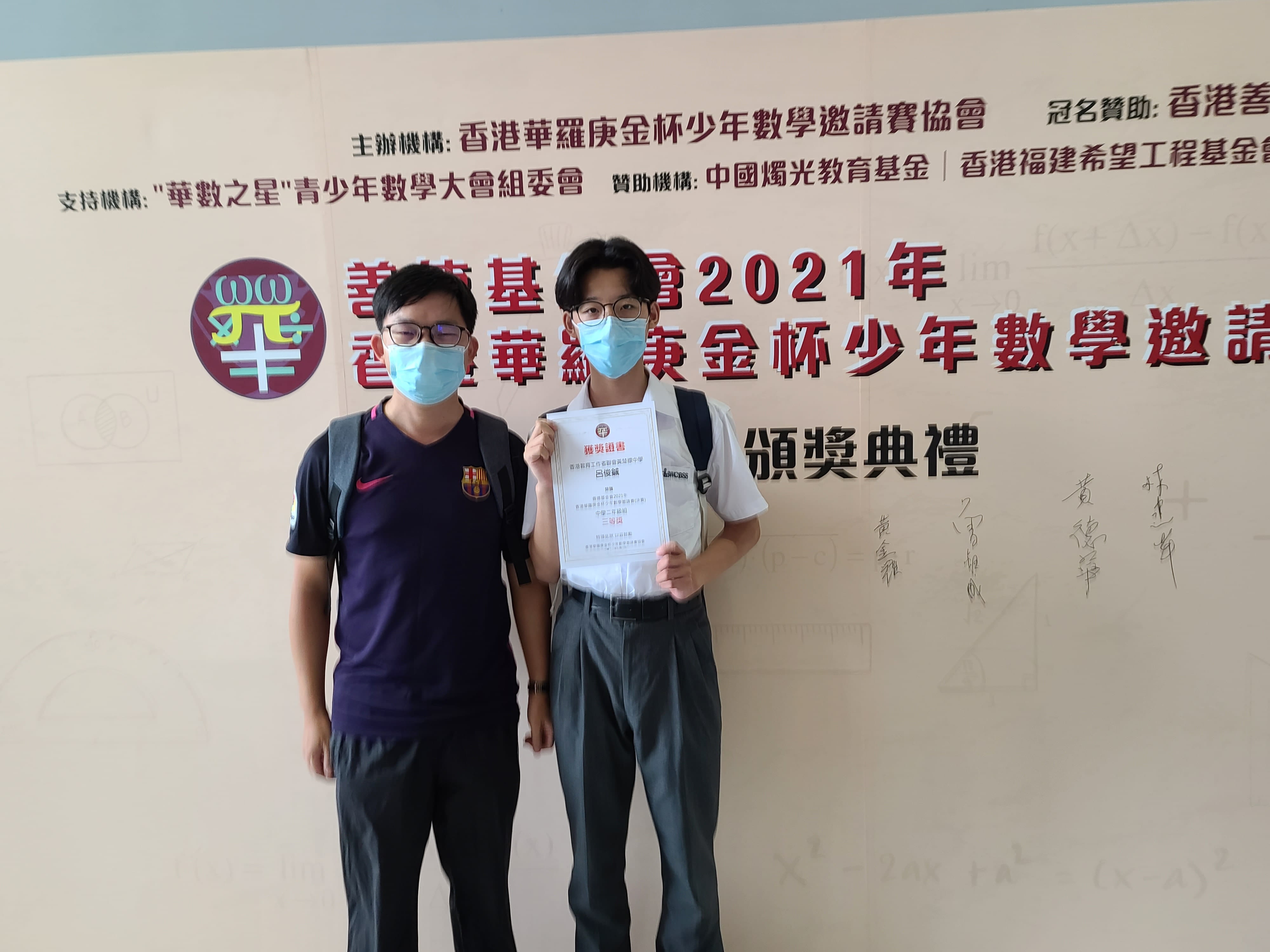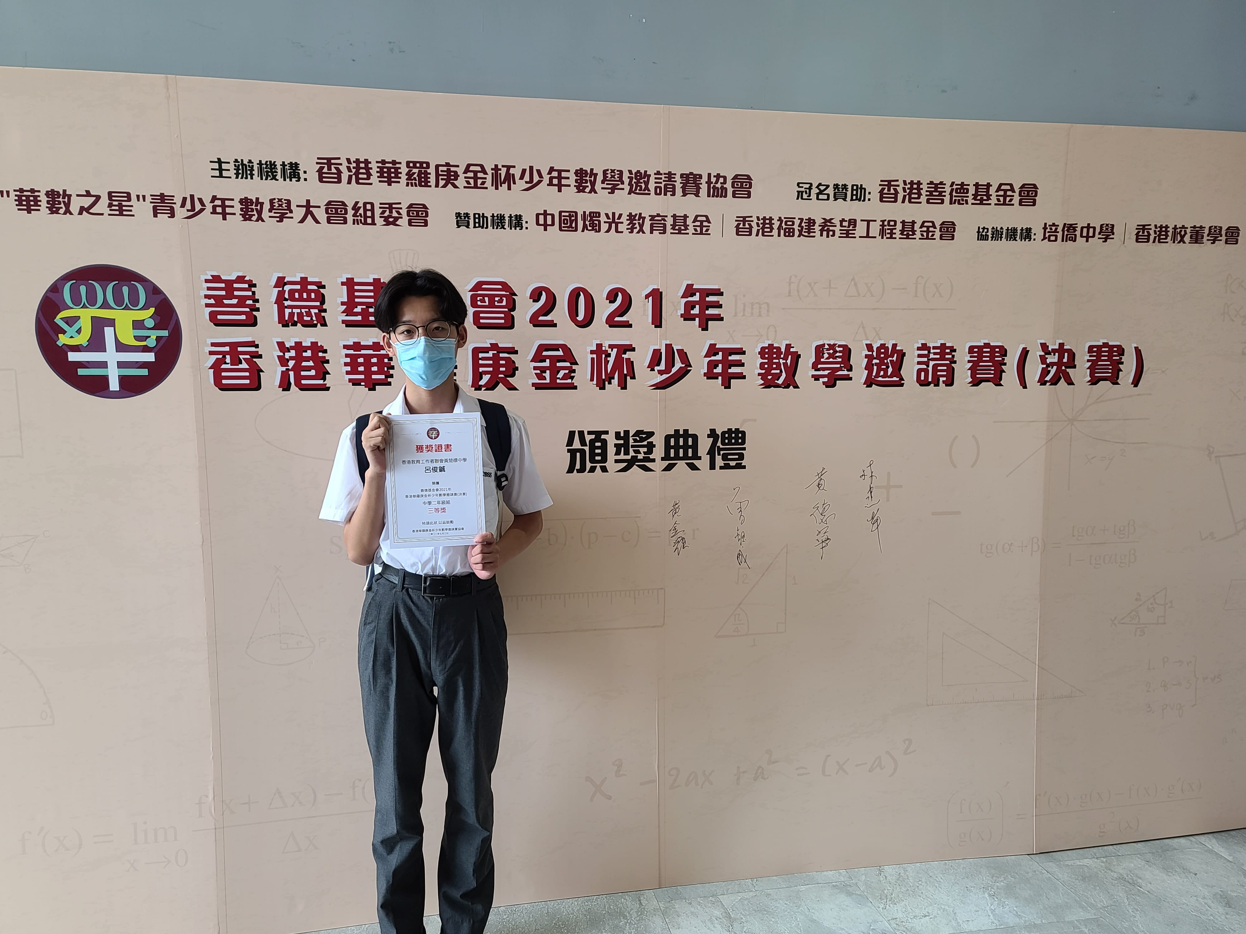 2A班呂俊鋮同學參加善德基金會2021年香港華羅庚金杯少年數學邀請賽(決賽),該比賽中二組別集合了來自超過50間學校的過百位數學精英,呂同學從中榮獲三等獎。