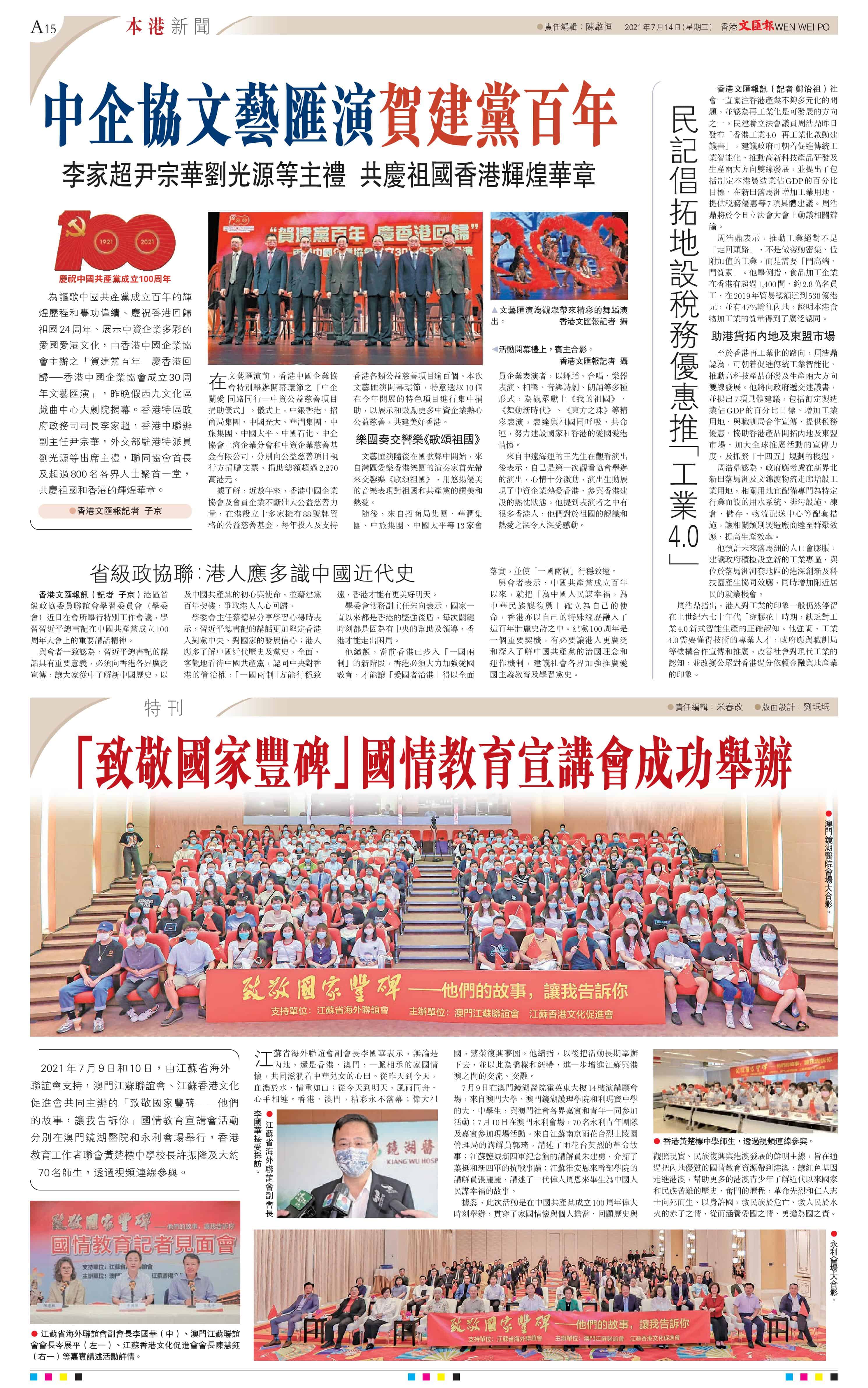文匯報:「致敬國家豐碑」國情教育宣講會成功舉辦(2021-7-14)