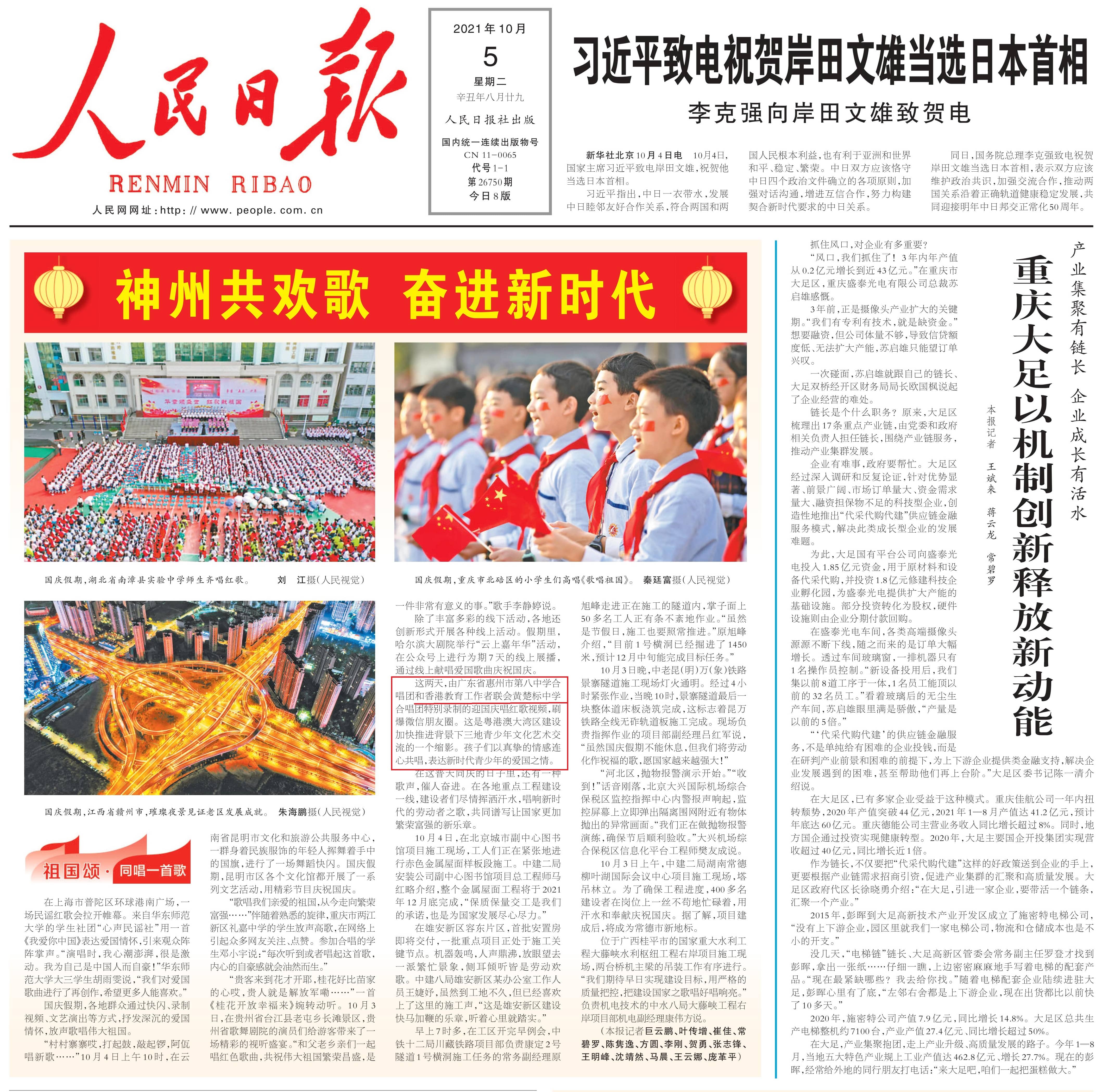 人民日報頭版報道我校《今天是你的生日》音樂視頻(人民日報 A1 2021年10月5日)