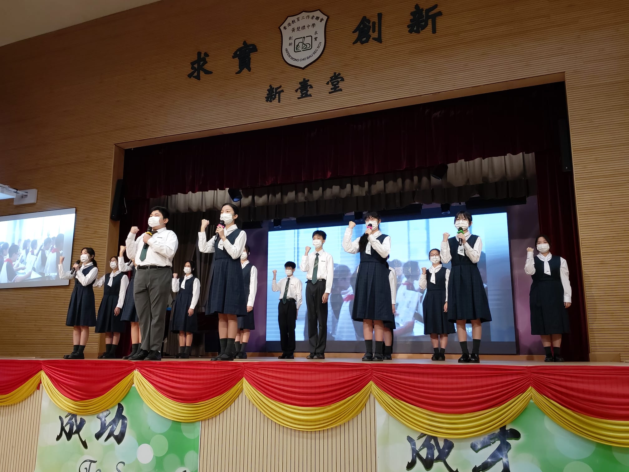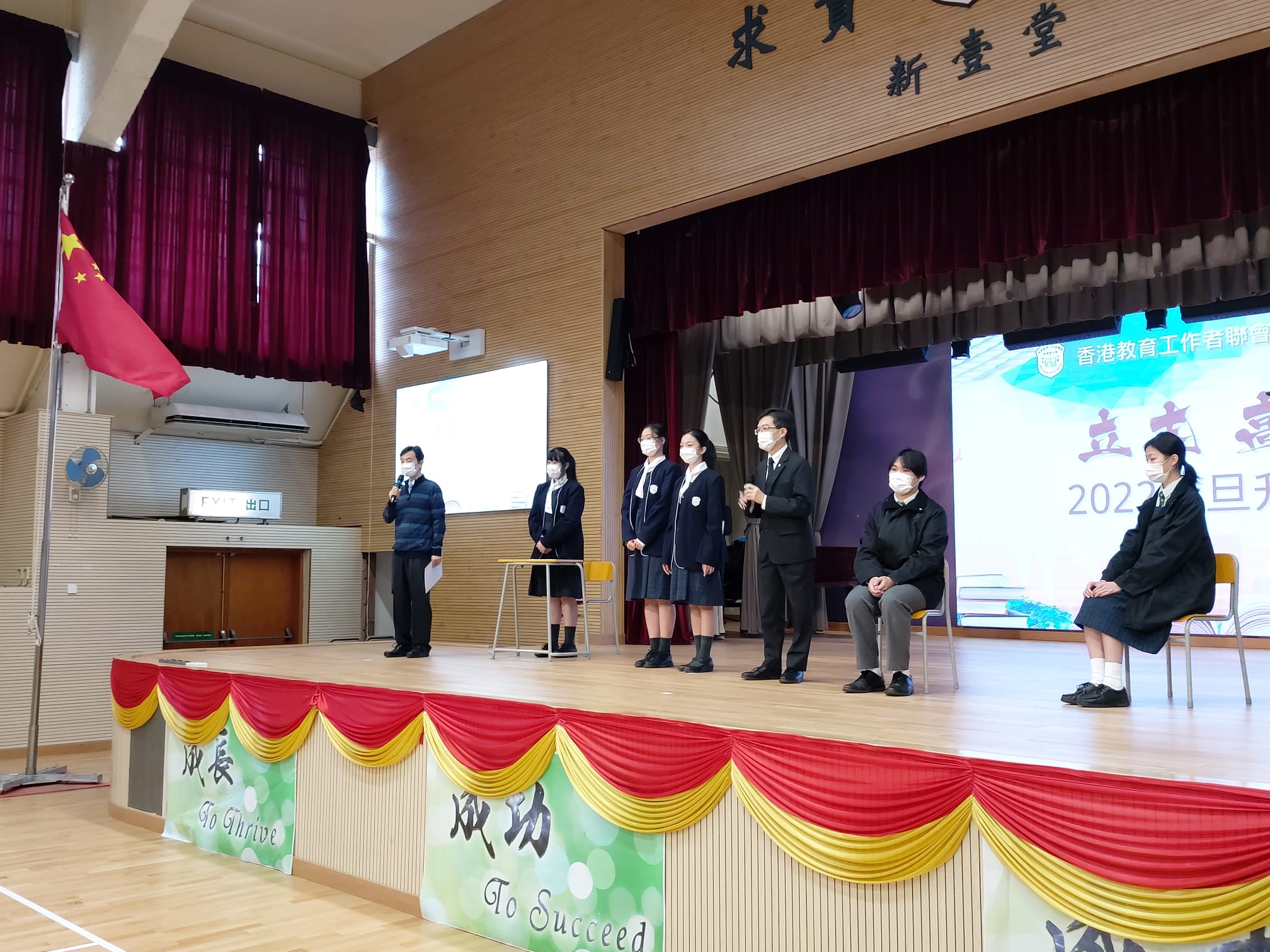 許校長致辭時,以「一日之計在於晨,一歲之計在於春,一生之計在於勤」,勉勵學生及早訂定目標,努力奮鬥,爭取成就。他亦提醒學生高飛方能望遠,希望學生充實自我,以更高的角度,認識社會,為國家發展作出貢獻。許校長隨後帶領中一至中六級的學生代表,於典禮上發表新年願望,表達對社會發展、學習成長,以至家庭生活的美好祝願,並展示師生合力創作的圖畫,象徵以團結、和諧、美滿,迎接新的一年。