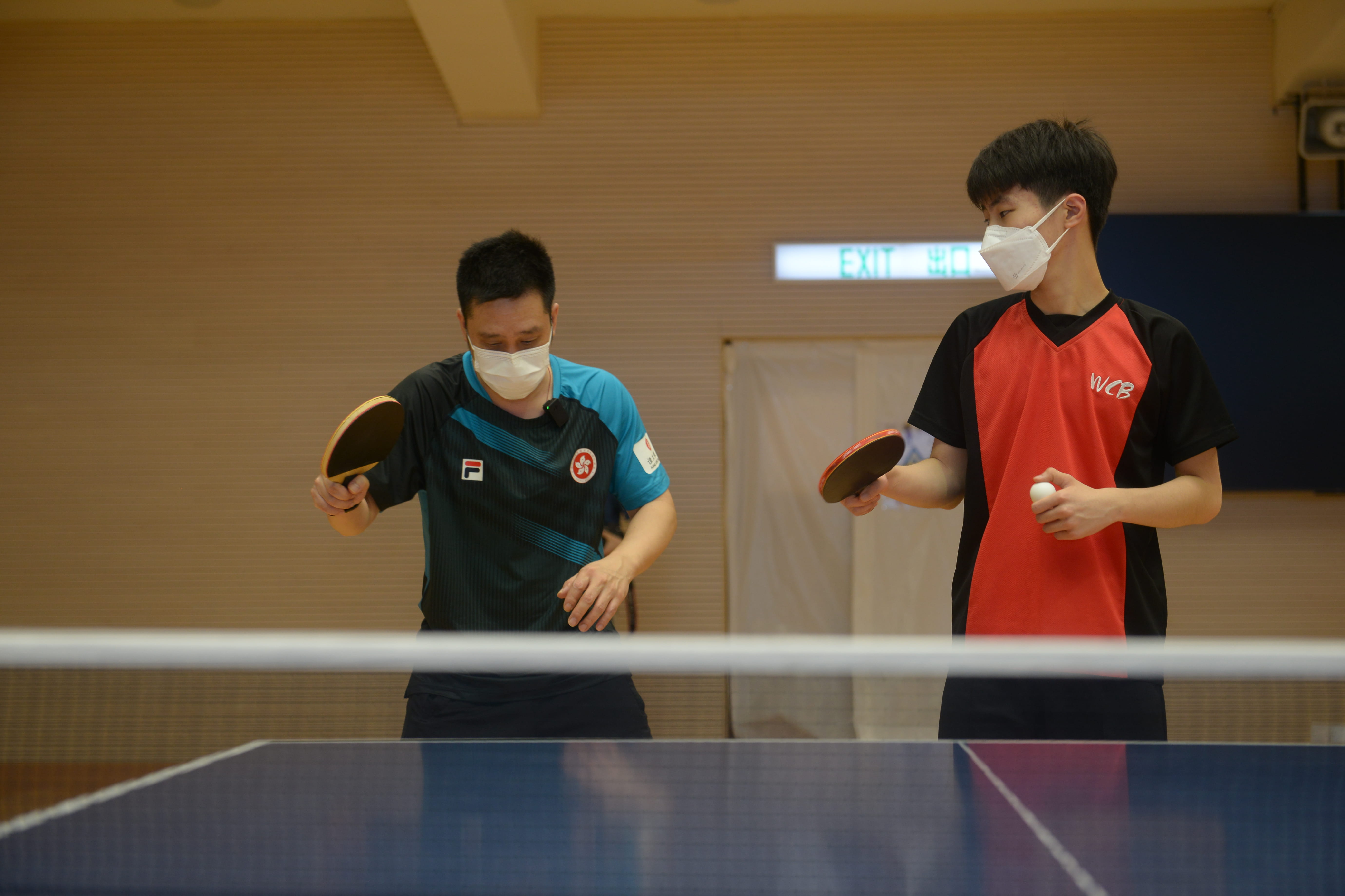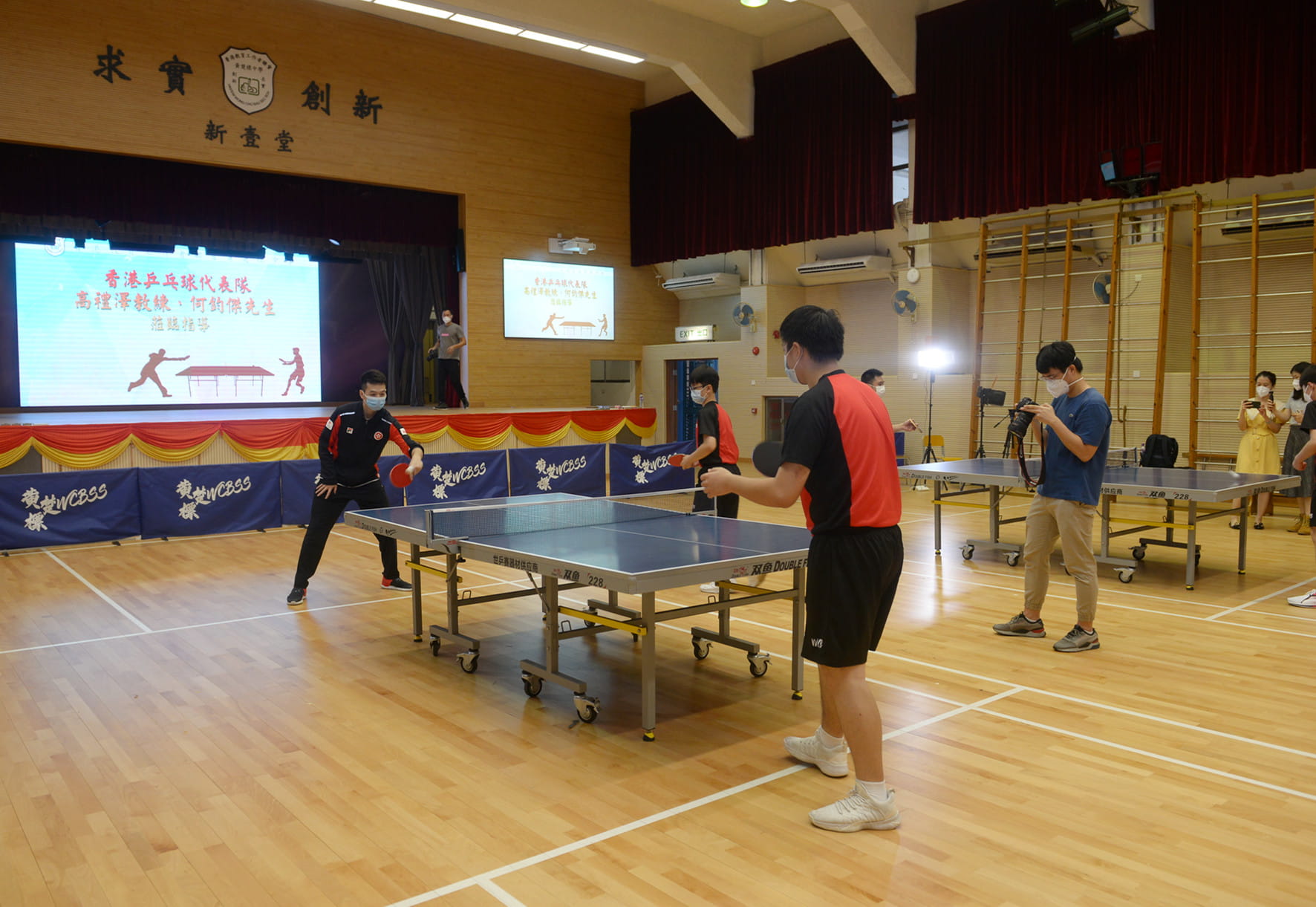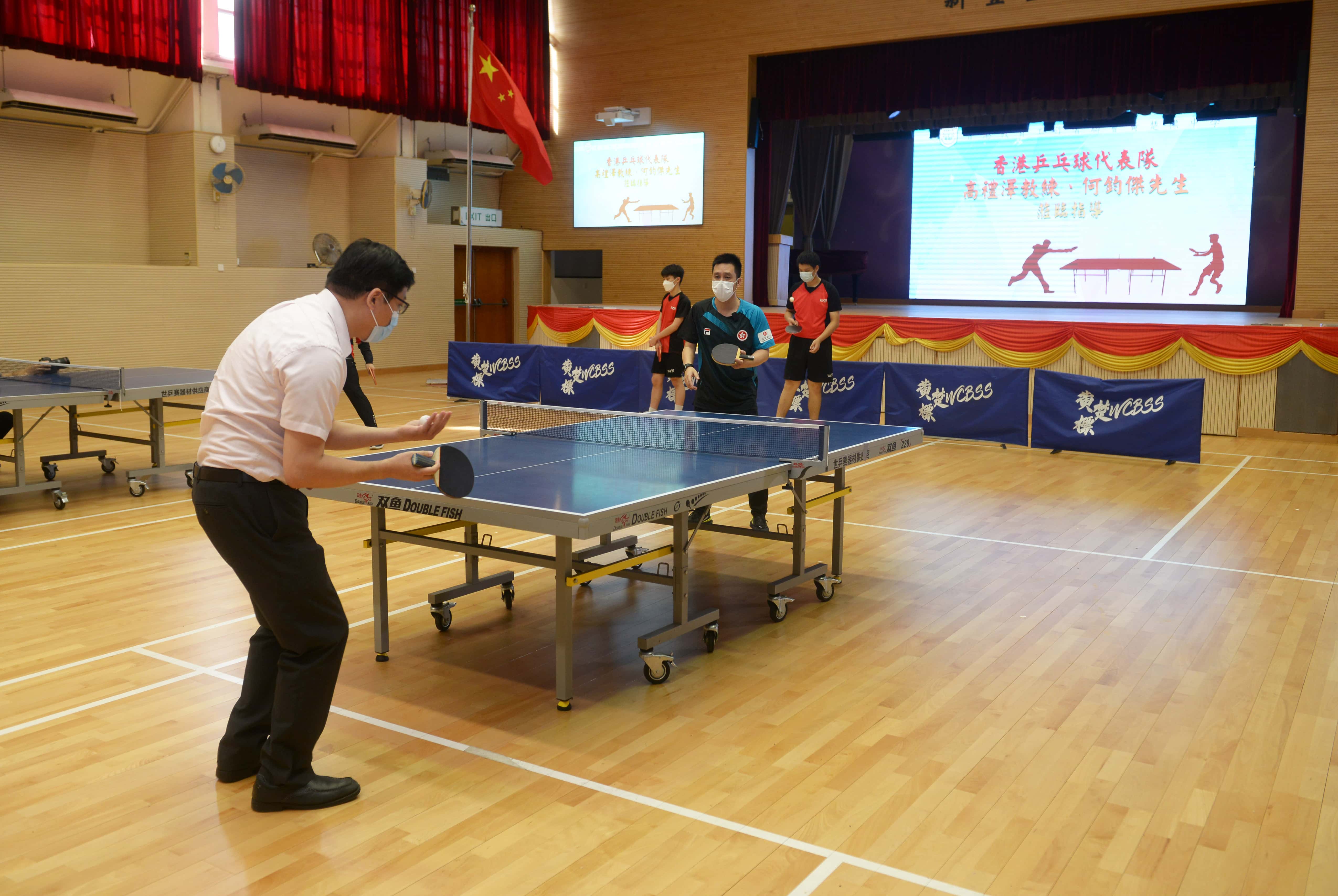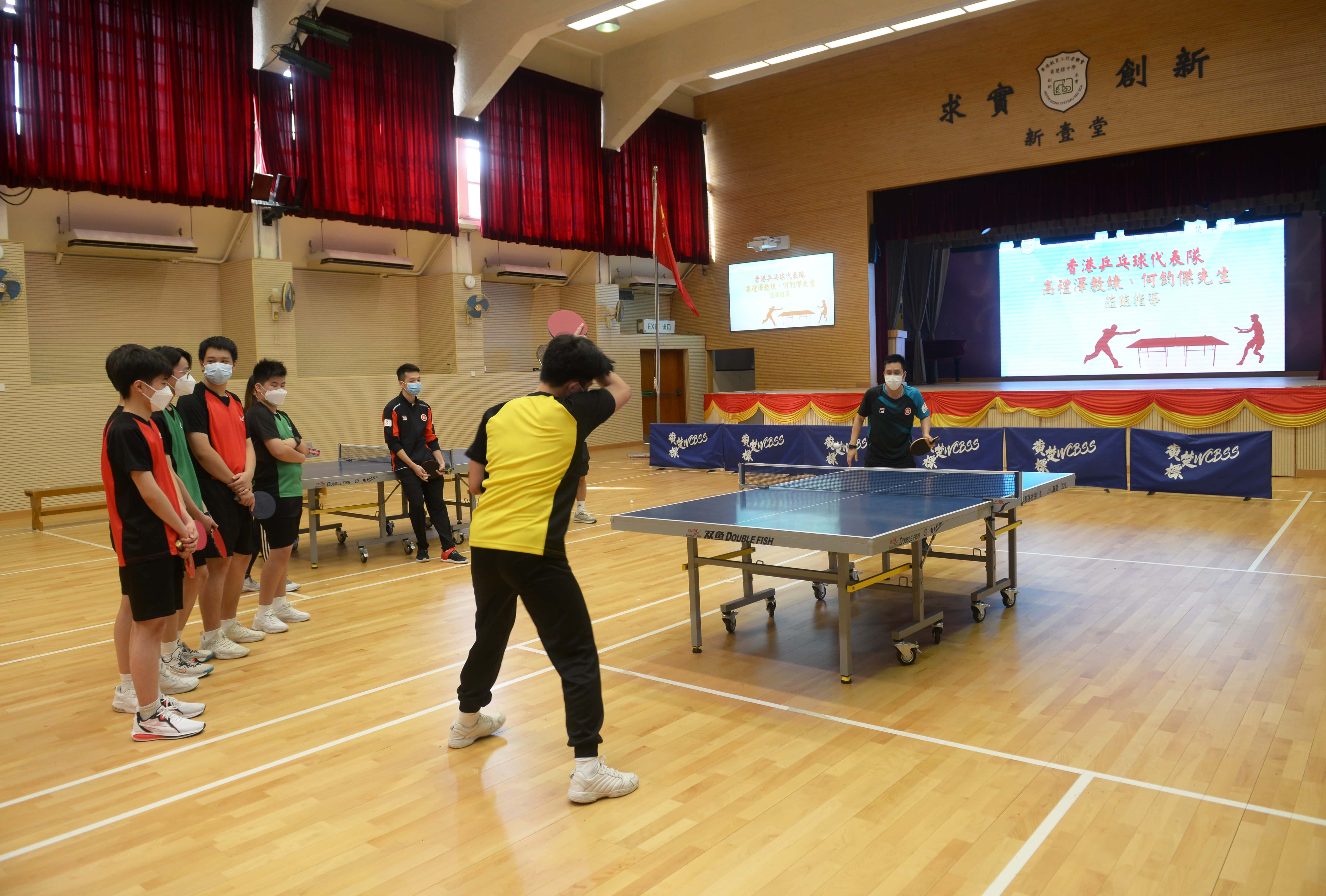 為了推廣乒乓球運動,我校近日邀請香港乒乓球代表隊現役教練高禮澤、男隊隊員何鈞傑到校訪問,並與我校乒乓球隊小將們切磋球技,指導他們提升乒乓球實戰的技巧。兩位專業運動員嫻熟的動作、精彩的示範不時引起同學們的喝彩。示範結束後,同學們爭相請兩位嘉賓在球拍上簽名留念。