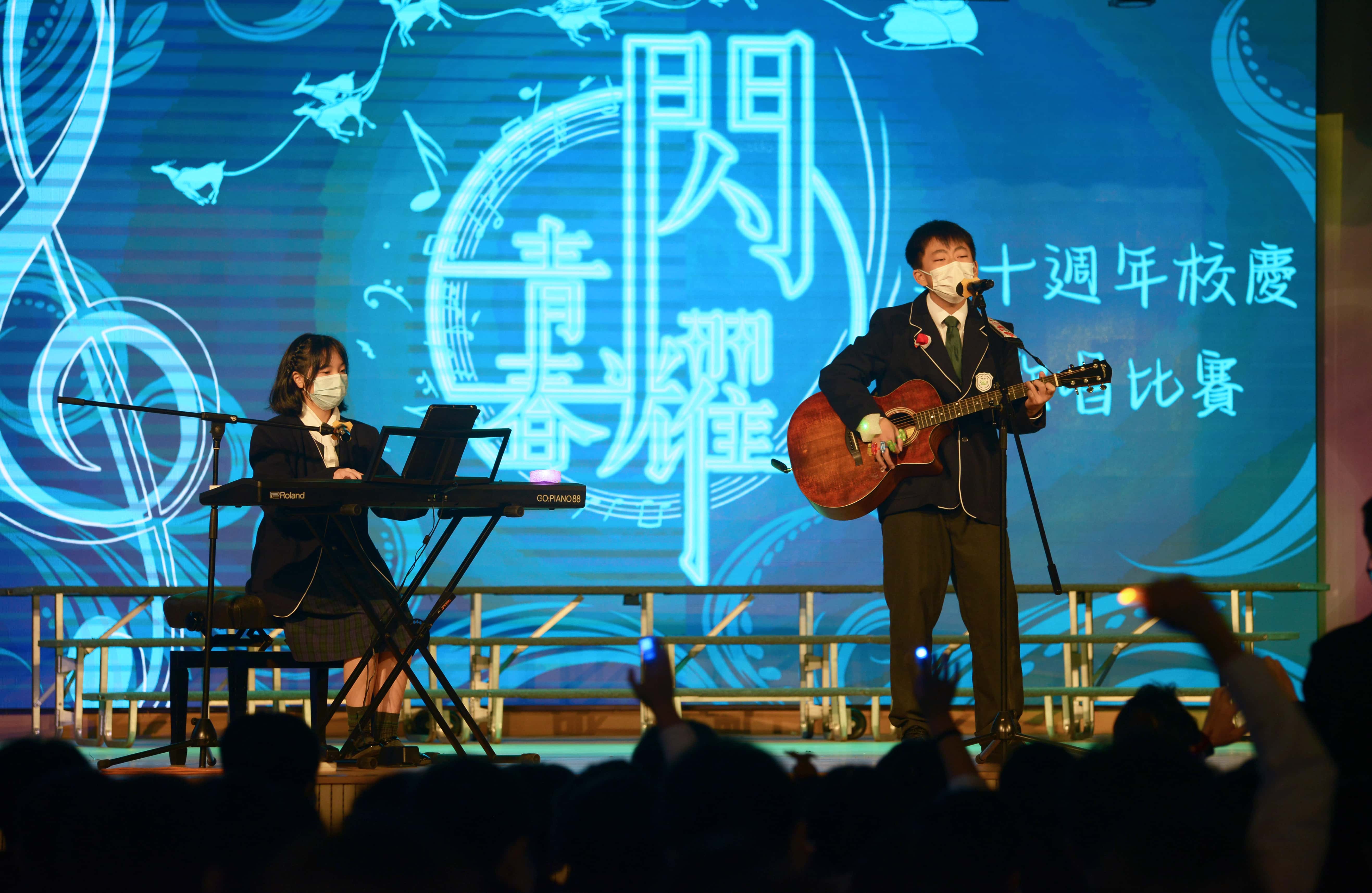 今天是一年一度的班際及社際歌唱比賽總決賽,為了讓學生發揮才華,莫負韶光,本年度歌唱比賽以「閃耀青春」為主題。參賽者都是通過了初賽,在六十多隊中脫穎而出的精英,表演精彩不在話下。他們個個施展渾身解數,無論是歌藝、台風、舞蹈編排以至團隊默契,都讓人印象難忘。台下觀眾也被參賽者帶動情緒,拍手聲、歡呼聲不絕於耳。
