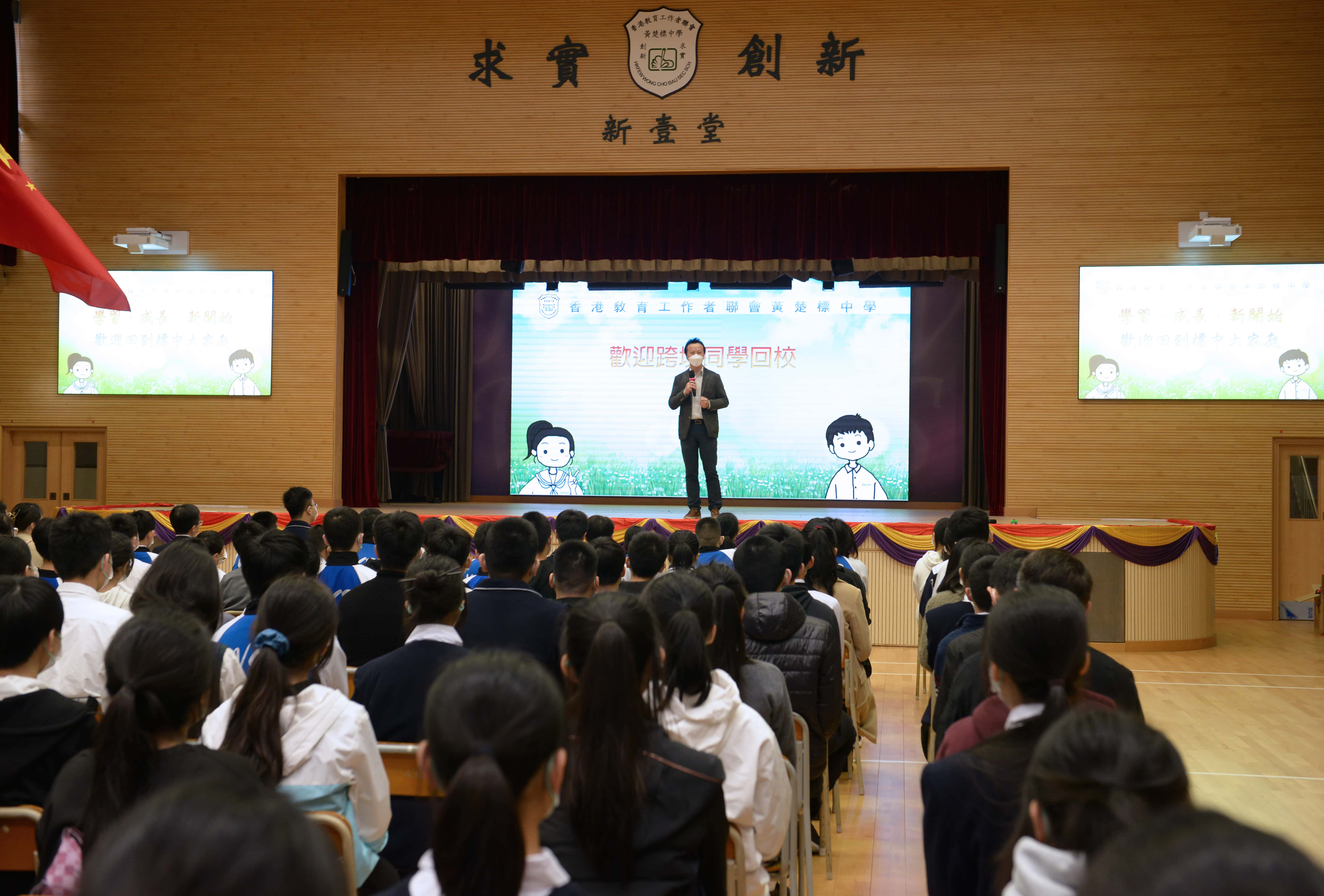 為了幫助跨境同學更快熟悉校園生活,我校特意舉辦了「歡迎跨境學生回校儀式」。歡迎儀式在莊嚴的升旗禮中展開,當國歌聲響起,同學們齊行注目禮,青春的面孔在國旗下顯得更加朝氣蓬勃。接著,許振隆校長向大家致歡迎辭,他回憶三年的網課雖不易,但並未阻礙大家學習。重新回到標中大家庭是一個嶄新的開始,鼓勵大家要做一個有理想,肯擔當,能吃苦,敢於為自己的夢想奮鬥的新時代青年人。