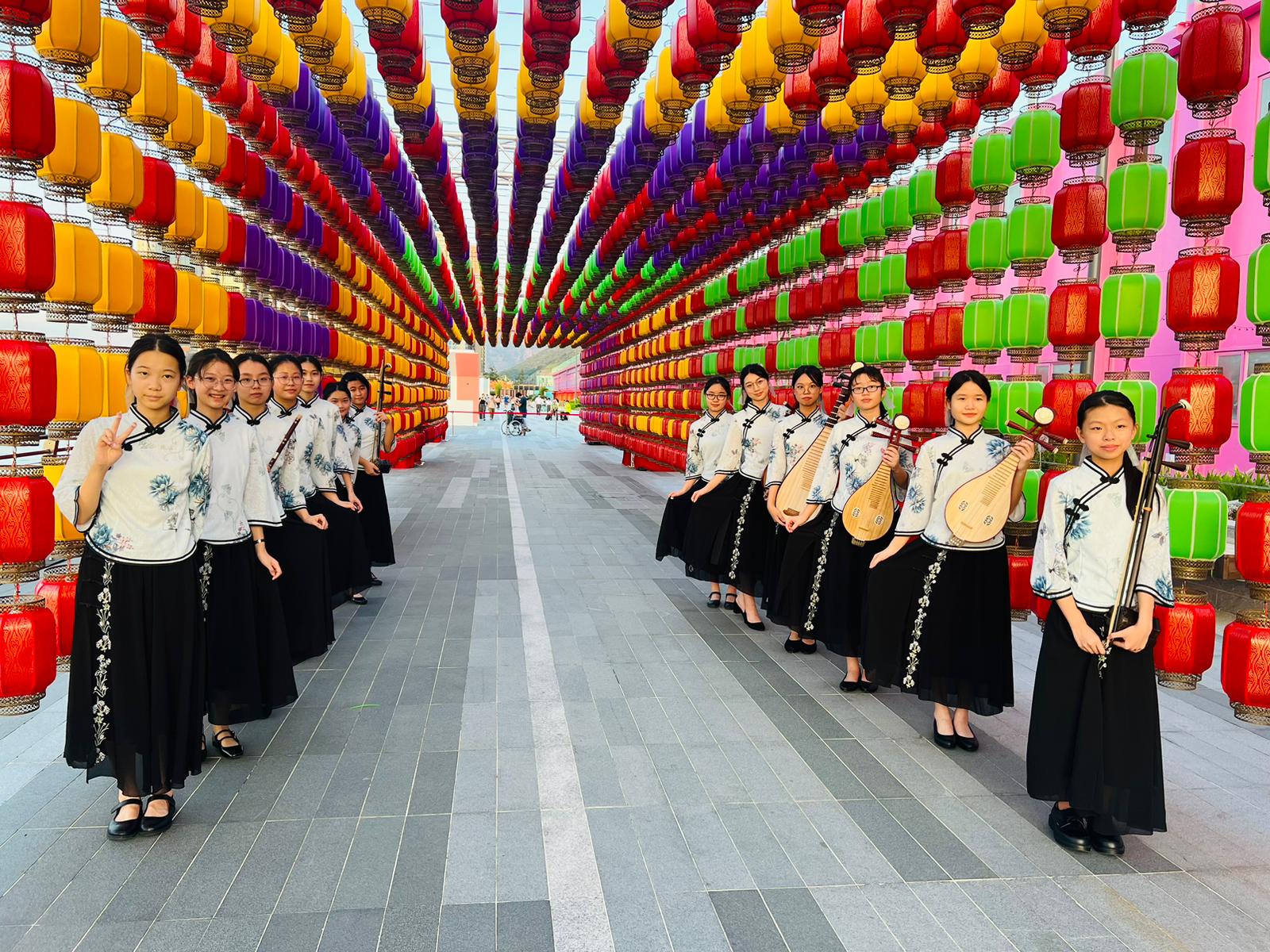 中秋將至,我校中樂團獲邀參與由土木工程拓展署轄下可持續大嶼辦事處及離島民政事務處舉辦的「月照離島迎國慶中秋綵燈會」亮燈儀式。我校中樂成員特別演奏《彩雲追月》一曲為綵燈會揭開序幕,許校長更擔任活動嘉賓。人月兩圓,希望中國的人民共同慶祝國慶及中秋節,好好感受月是故鄉圓。