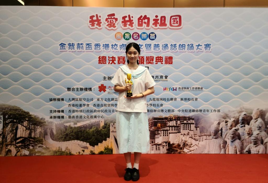 我校辯論隊代表中五級曾安娜同學曾於九月參加由香港潮州商會主辦,香港教育工作者聯會、香港大公文匯傳媒集團、藝術香港聯合主辦的「我愛我的祖國」 金紫荊杯校際作文暨普通話朗誦大賽,憑《霧起黃鶴樓》一文成功晉身複賽,擊敗眾多學校,並奪得二等獎。本日曾同學於香港故宮文化博物館出席頒獎典禮,與一眾得獎者在台上領獎,為校爭光,深感驕傲。