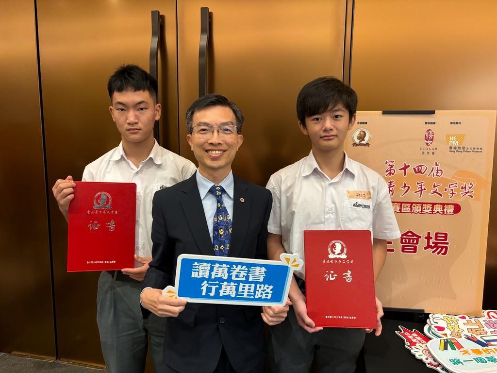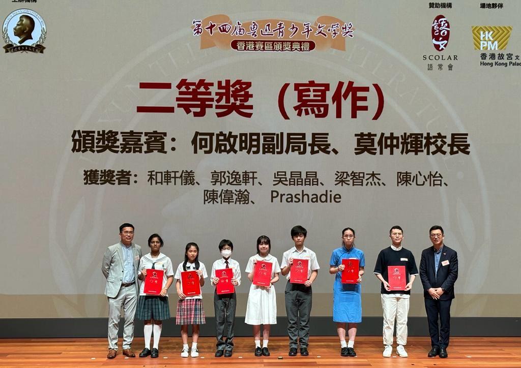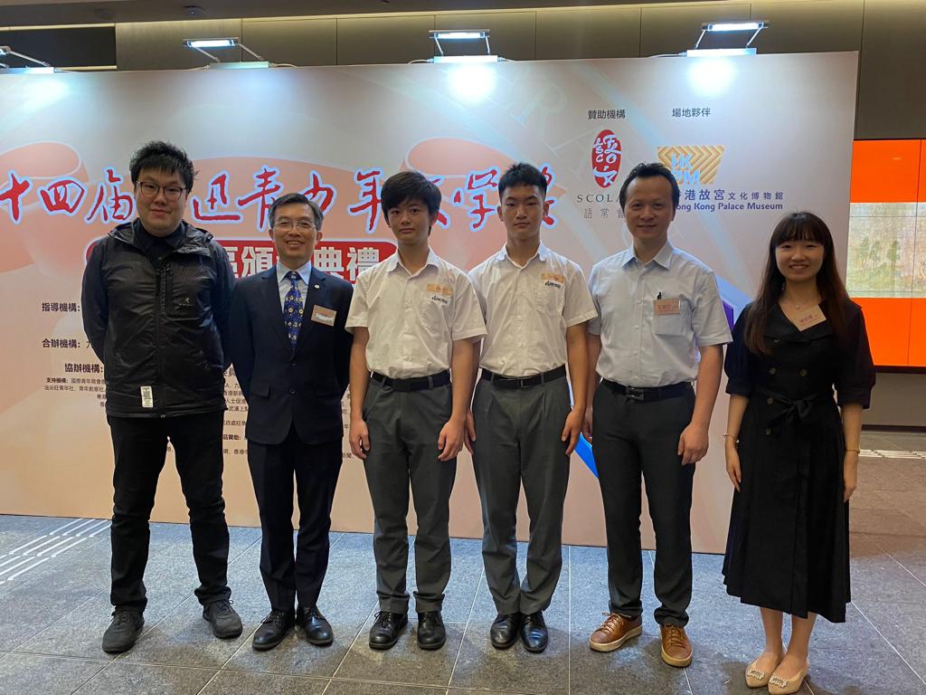 本校許振隆校長、王益鈞副校長及兩位教師陪同5C梁智杰同學和3E吉星翰同學出席第十四屆魯迅青少年文學獎香港賽區頒獎典禮。梁智杰同學勇奪「母語組高中組二等獎」,吉星翰同學亦獲得「母語組初中組良好獎」,我校學生能得到如此佳績,實屬難得,可喜可賀!此外,梁智杰同學的指導老師梁偉豪老師更榮獲「最佳指導教師獎」,可謂肯定了我校教師悉心指導及栽培同學的成果。