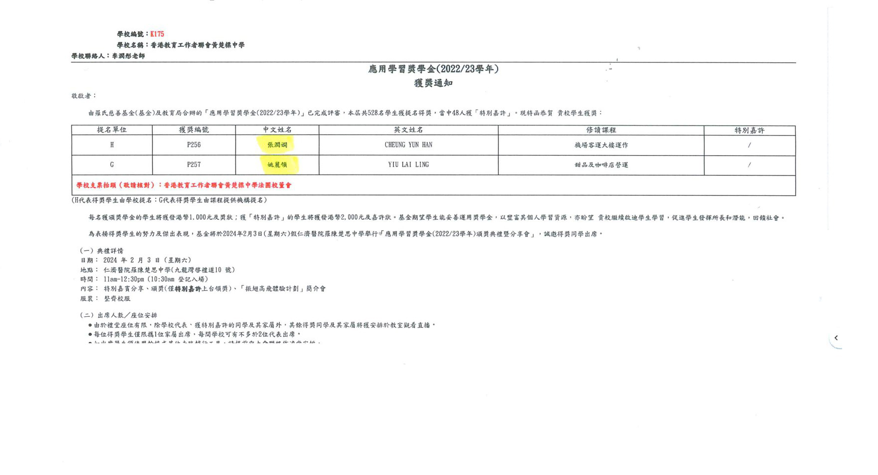 我校兩位同學榮獲應用學習獎學金(2022-2023)